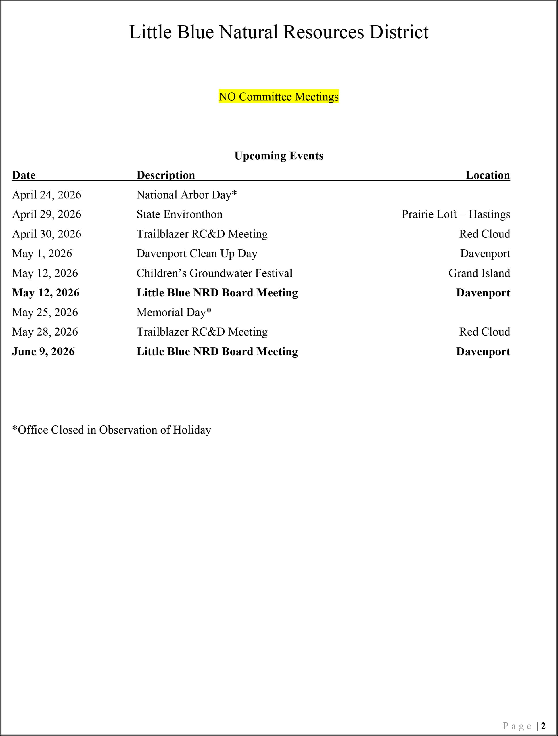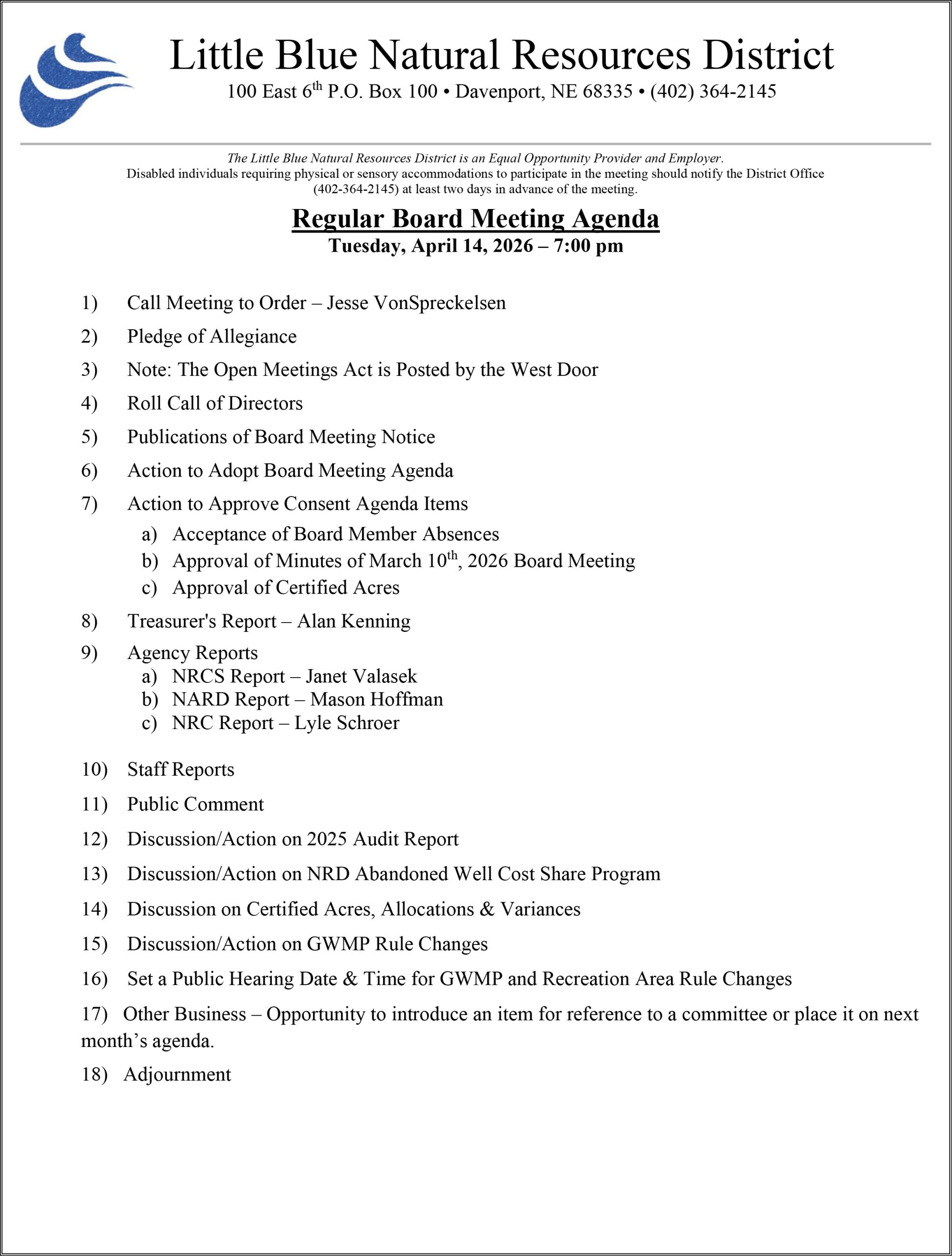 The Little Blue NRD board of directors will meet in regular session on Tuesday, April 14th, 2026, at 7:00 PM at the district office in Davenport. The agenda for the meetings will be kept continually current and are available for public inspection during the regular office hours at the Little Blue NRD office.