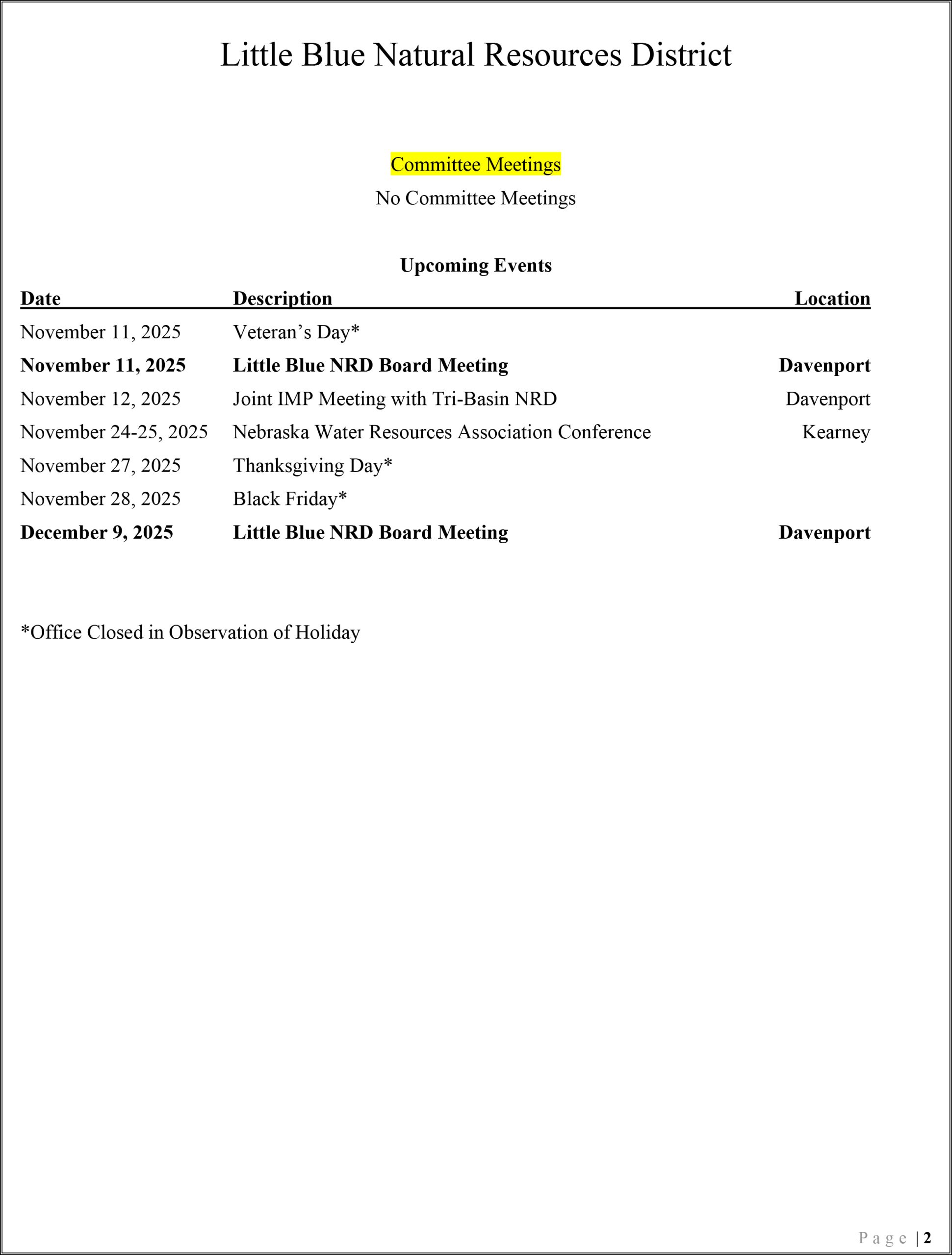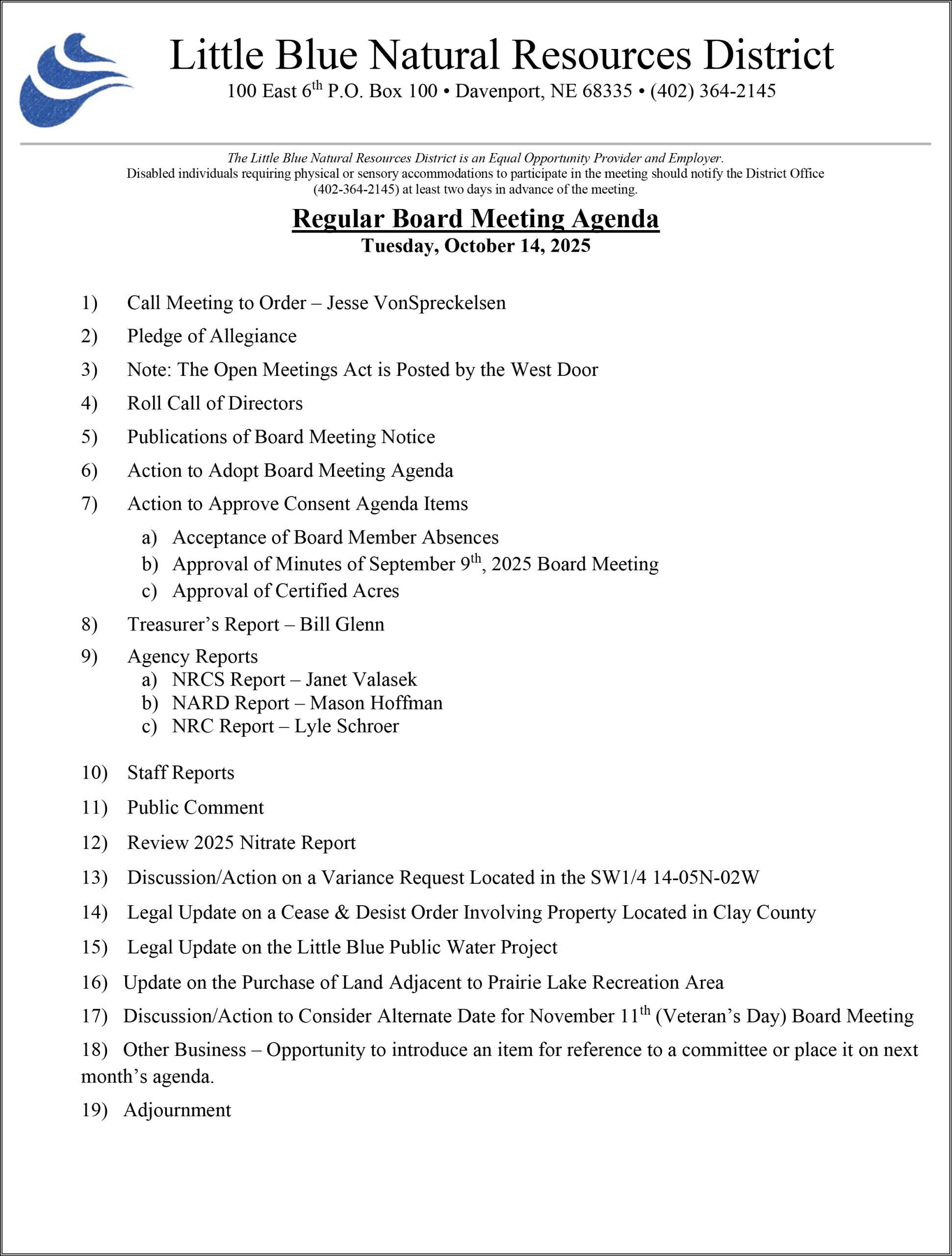The Little Blue NRD Board of Directors meeting starts at 7:00 pm, October 14th, 2025 in Davenport, Nebraska at the headquarters Board Meeting Room located on the south side of the building, east door.